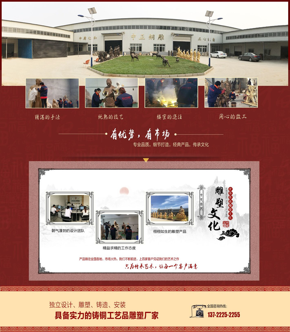 唐縣中正鑄銅雕塑制作生產(chǎn)廠家是一家具有獨(dú)立設(shè)計(jì)、雕塑、鑄造、制作施工能力的單位。擁有完善的,大型的,先進(jìn)的生產(chǎn)設(shè)備,并由多位經(jīng)驗(yàn)豐富的高級(jí)鑄造技師指導(dǎo)生產(chǎn)及制作。公司主要鑄造人物雕塑、動(dòng)物銅雕、城市雕塑、銅佛像、銅獅子、鑄銅鼎、銅鐘等銅工藝品,可按客戶提供銅雕圖片訂做加工,銅雕塑做工精美,質(zhì)量有保證。